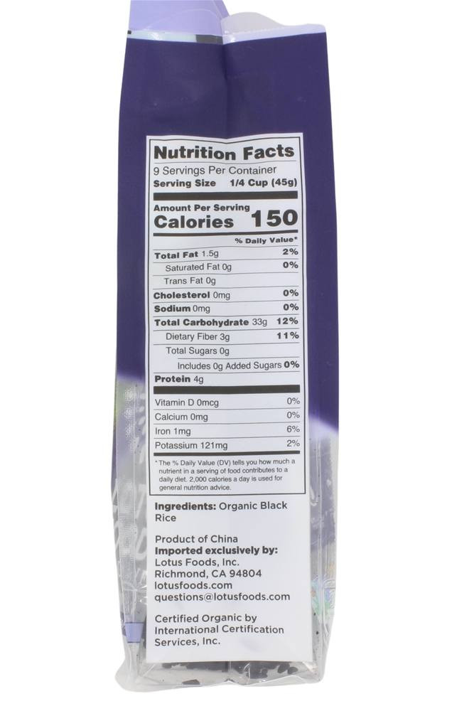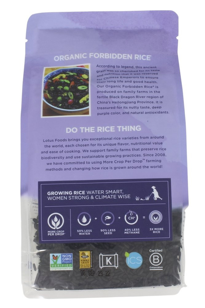 Enjoy Lotus Foods Rice, Forbidden. Attributes: 100% Organic, Kosher, Vegan, Gluten Free, Wheat Free, (Please Check The Manufacturer’s Details For Contents As We Are Unable To Guarantee Ingredient Details And They May Change Without Notice). (Note: Description is informational only. Please refer to ingredients label on product prior to use and address any health questions to your Health Professional prior to use.