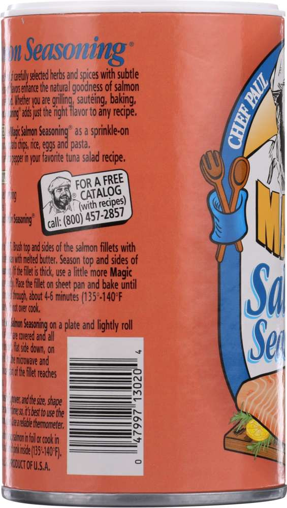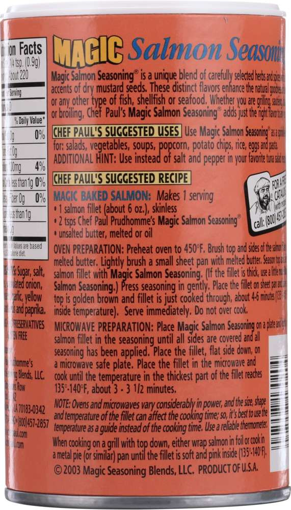 Enjoy Chef Paul Salmon Magic Seasoning. All-Natural, No Msg Or Preservatives, And Kosher Approved No Trans Fat; No Cholesterol Unique Blend Of Carefully Selected Herbs And Spices (Note: Description is informational only. Please refer to ingredients label on product prior to use and address any health questions to your Health Professional prior to use.