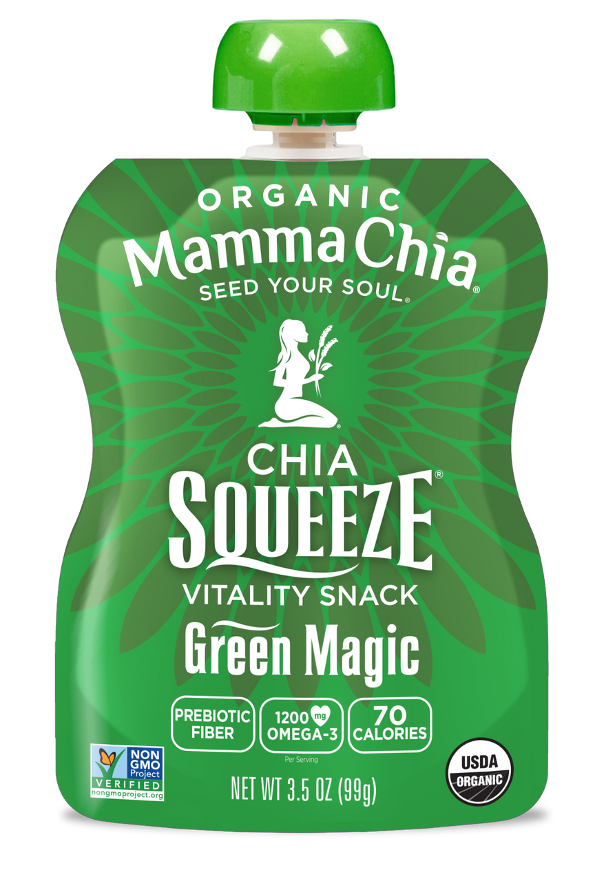 Squeeze some natural vitality and powerful nutrients into your day!The Magic of Greens meets the Magic of Chia???! Green Magic Chia Squeeze combines tasty Bananas and Mangoes with Kale, Spirulina & Chlorella making this anytime, anywhere snack a delightful nutrient powerhouse! And perfect for every soul??s lunchbox! Our organic chia seeds are infused with delicious fruits and vegetables to create a convenient, fun and tasty snack for active people of all ages. Fueled with essential Omega-3s, protein, and fiber, Chia Squeeze is a satisfying anytime snack that naturally provides the vitality to power your soul??s purpose.