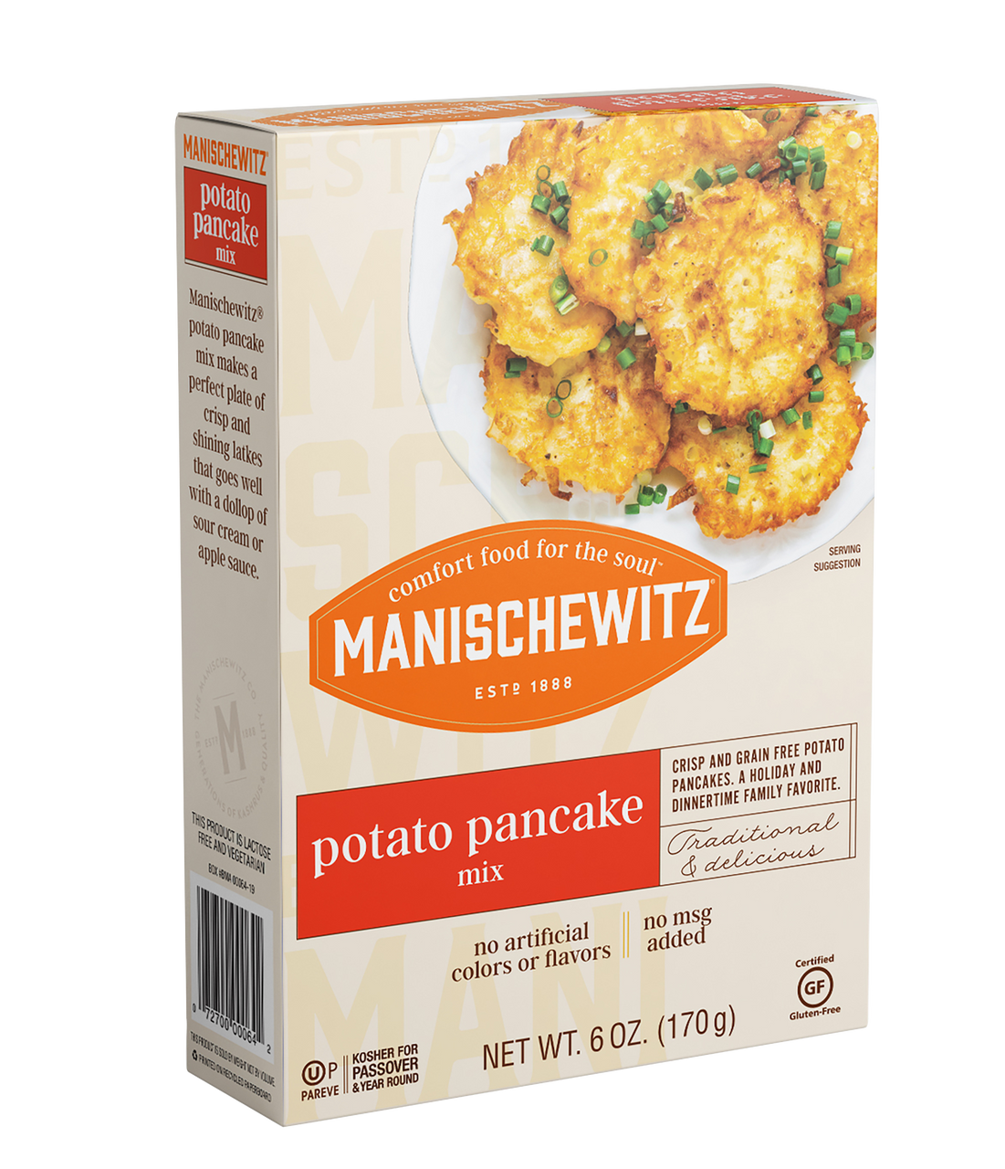 Enjoy Manischewitz Potato Pancake Mix (12×6 Oz). Manischewitz Potato Pancake Mix (Please note information is descriptional only. Please refer ingredients on product prior to use and please consult your health professional with any health or dietary matters before use.)