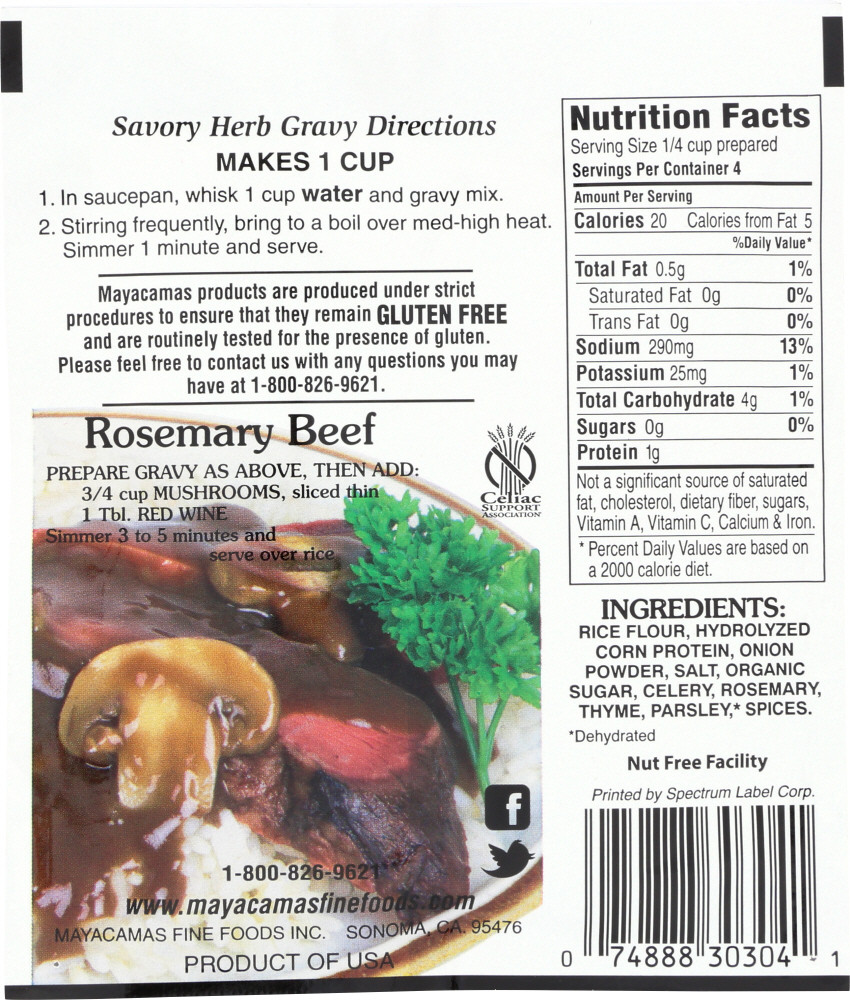 Deliciously simple and quick to prepare, Mayacamas Savory Herb Gravy Mix makes a great addition to the natural foods pantry. A rich blend of soy protein, rosemary, and thyme, this mix is all natural and gluten free, containing no hydrogenated oils or trans fats. Drizzle over pork roast or mashed potatoes for a sophisticated entree or a quick, satisfying traditional dish. Easy-to-follow instructions make preparation a snap, and the result is sure to be a hit with family and friends. Each package makes one cup of vegetarian gravy and includes quick and easy recipe ideas. Mayacamas products are produced in the United States under strict procedures to ensure that they remain gluten free and are routinely tested for the presence of gluten. A delightful complement to any meal, Mayacamas Gravy Mix comes in several flavors, including Brown, Chicken Flavor, Savory Herb, and Turkey Flavor.