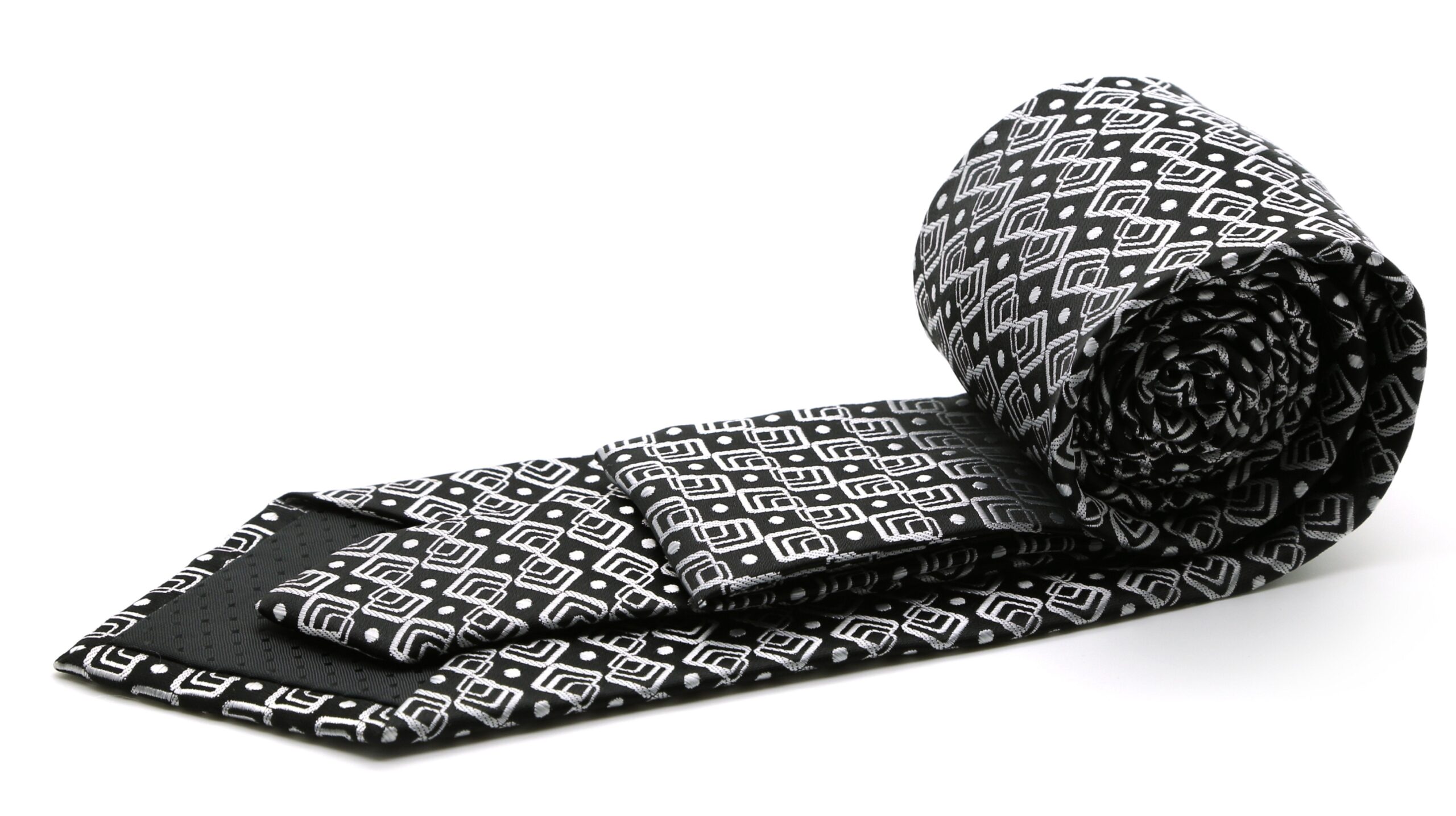 Mens G-1 Black Geometric Pattern Set. These fashionable neckties in many colors are perfect for men to wear with a suit or with a dress shirt in formal or business casual attire. Made of 100% microfiber each tie comes with a matching pocket square hanky. This is the perfect tie set to give your dad, uncle, step dad or grandfather as a gift. Each tie is 3.5 inches wide at the widest part of the base and 59 inches in total length when untied. Great for weddings, parties, costumes, uniforms, school teachers, police and more.