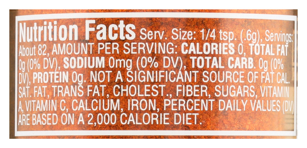 All natural; Salt free; No MSG; No preservatives; Non-irradiated. Cayenne Pepper puts hot, intense flavor into your recipes. Add heat to home fries, scrambled eggs and BBQ sauces. Liven up your Mexican and Southwestern style dishes. Start with a pinch and adjust to personal taste.