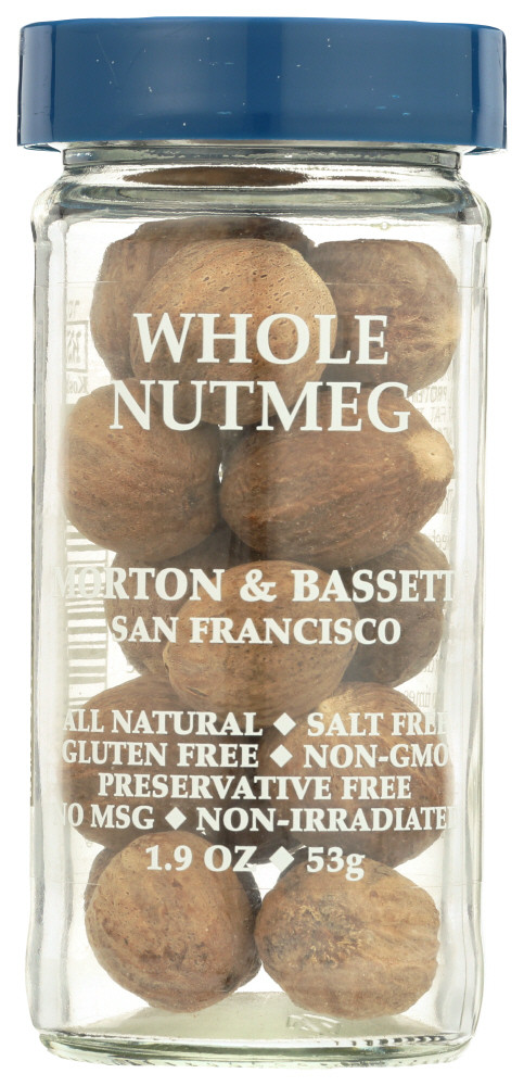 Enjoy Morton & Bassett Whole Nutmeg Jars . 100% All Natural; Kosher Certified Salt Free; No Msg; No Preservatives; Non-Irradiated Warm And Rich Aroma Gives A Depth To Both Sweet Desserts And Savory Dishes Made Of High-Quality Spices From Around The World; Packaged In San Francisco, California (Note: Description is informational only. Please refer to ingredients label on product prior to use and address any health questions to your Health Professional prior to use.