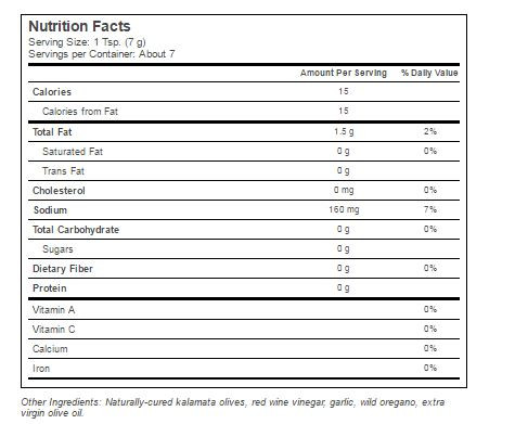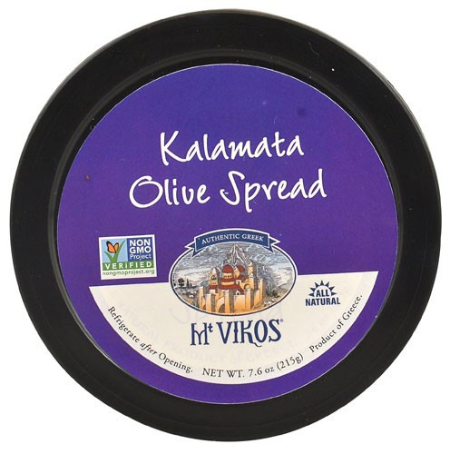 Enjoy Mt Vikos Kalamata Olive Spread . Naturally Cured Kalamata Olives, Red Wine Vinegar, Garlic, Wild Oregano, Extra Virgin Olive Oil. (Note: Description is informational only. Please refer to ingredients label on product prior to use and address any health questions to your Health Professional prior to use.