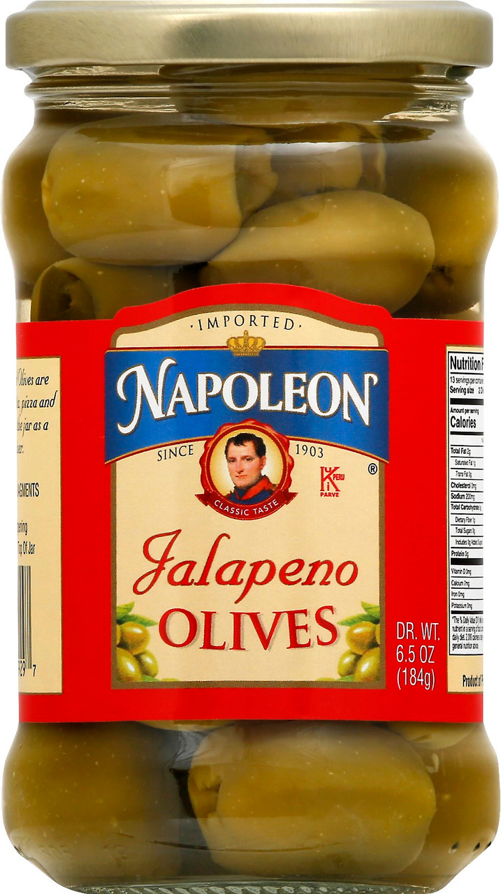 Enjoy Napoleon Jalapeno Stuffed Olives. Napoleon Jalapeno Stuffed Olives, 6.5 Oz (Note: Description is informational only. Please refer to ingredients label on product prior to use and address any health questions to your Health Professional prior to use.