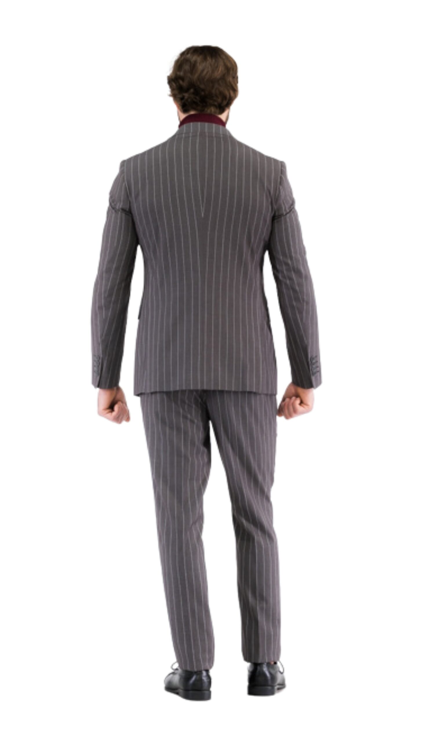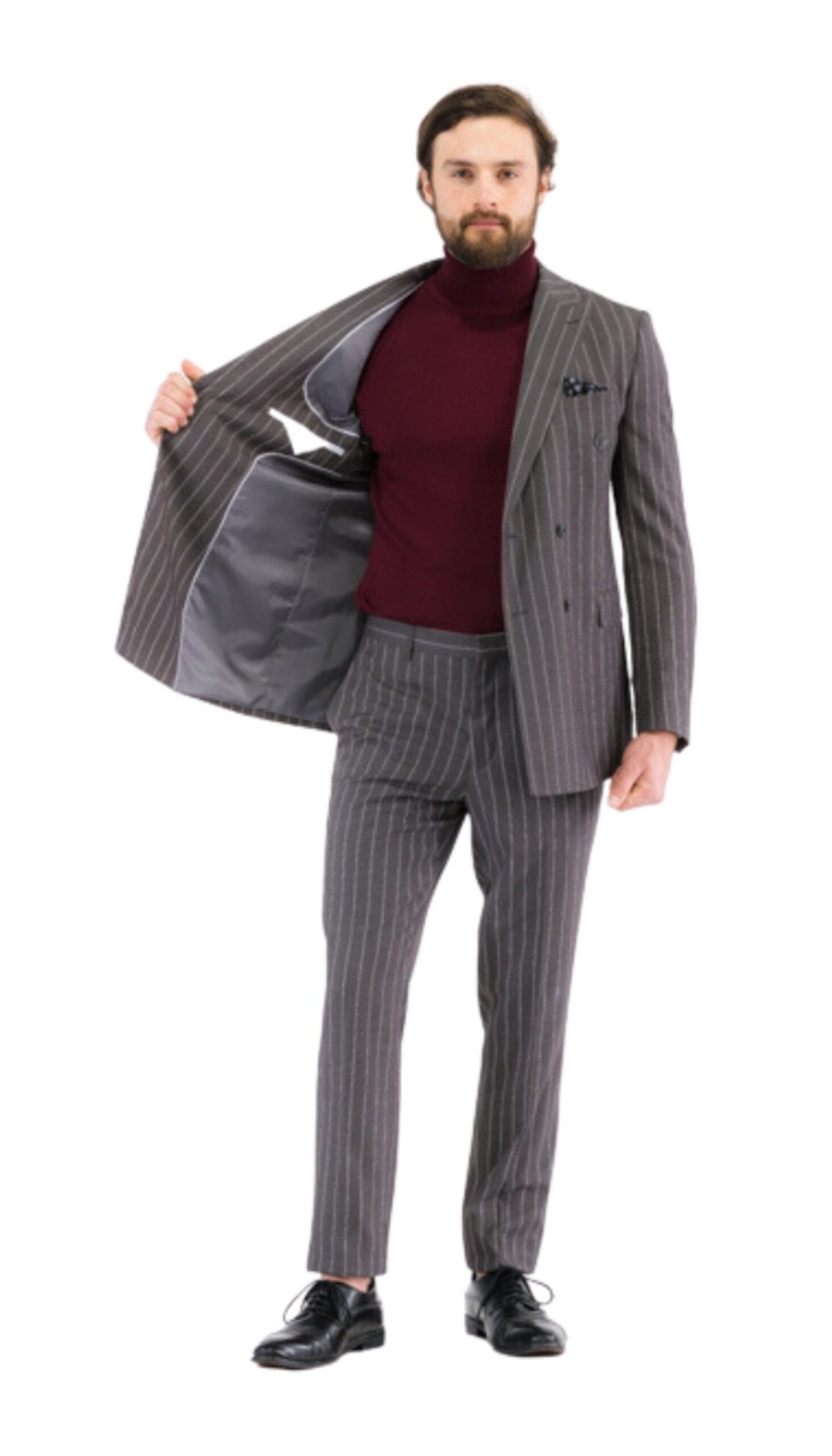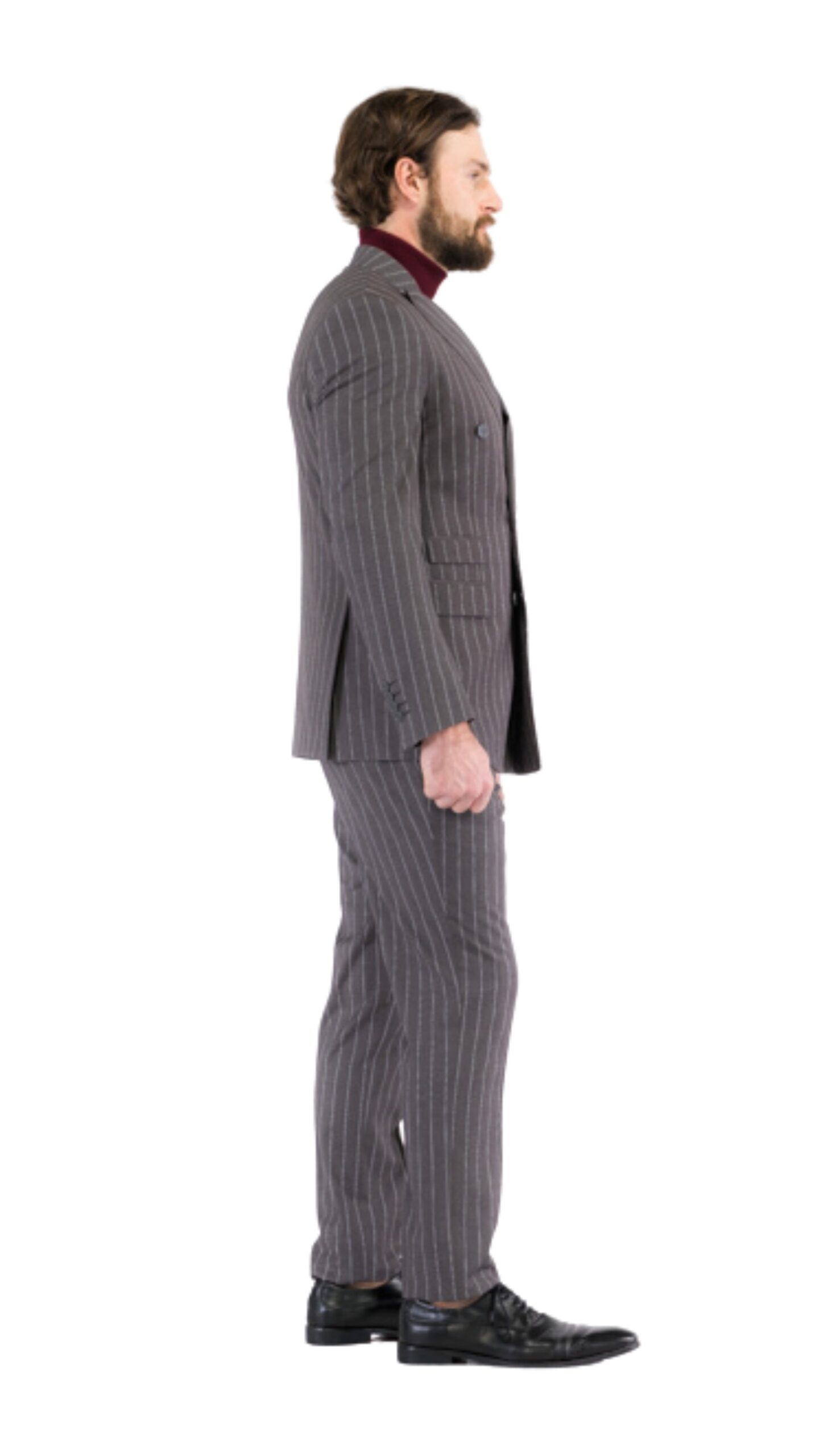 Jacket: The focal point of this ensemble is the double-breasted jacket, exuding a sense of authority and refinement. The peak lapel accentuates the shoulders and frames the face, adding a touch of timeless sophistication. Its structured silhouette and tailored fit create a flattering profile, emphasizing a lean and modern look. The double-breasted closure not only enhances the suit’s visual appeal but also accentuates the waist, resulting in a sharp and polished appearance.