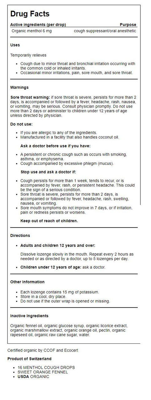 Organic Throat Coat Sweet Orange Fennel Cough Drops 16 Drops (Pack of 12)