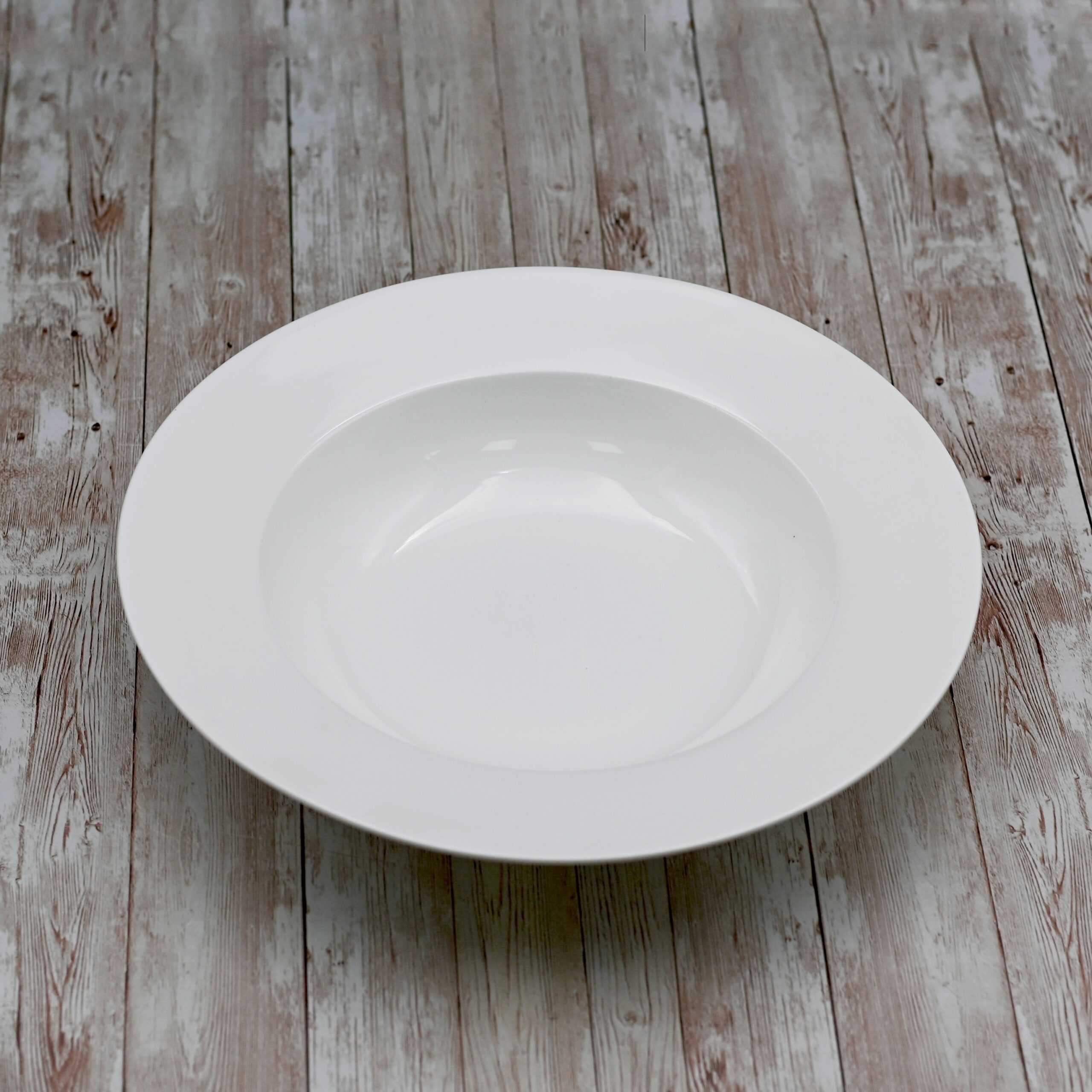 Plate, 25 oz. (750 ml), 11" dia. (28 cm), round, deep, rolled rim, dishwasher/microwave safe, ovenproof (up to 572°F/300°C), fully vitrified, fine porcelain, white.