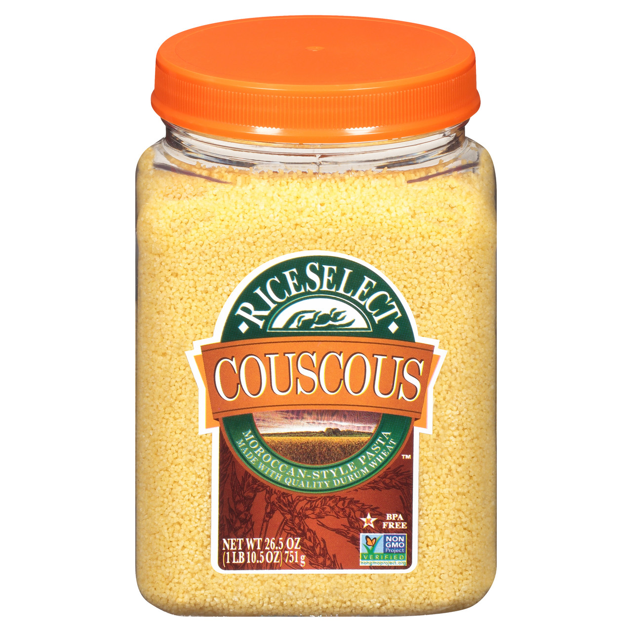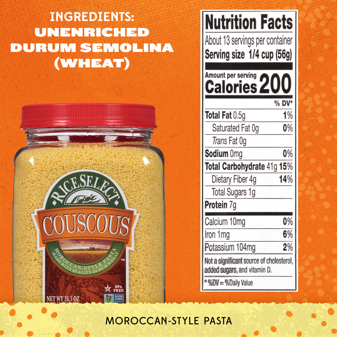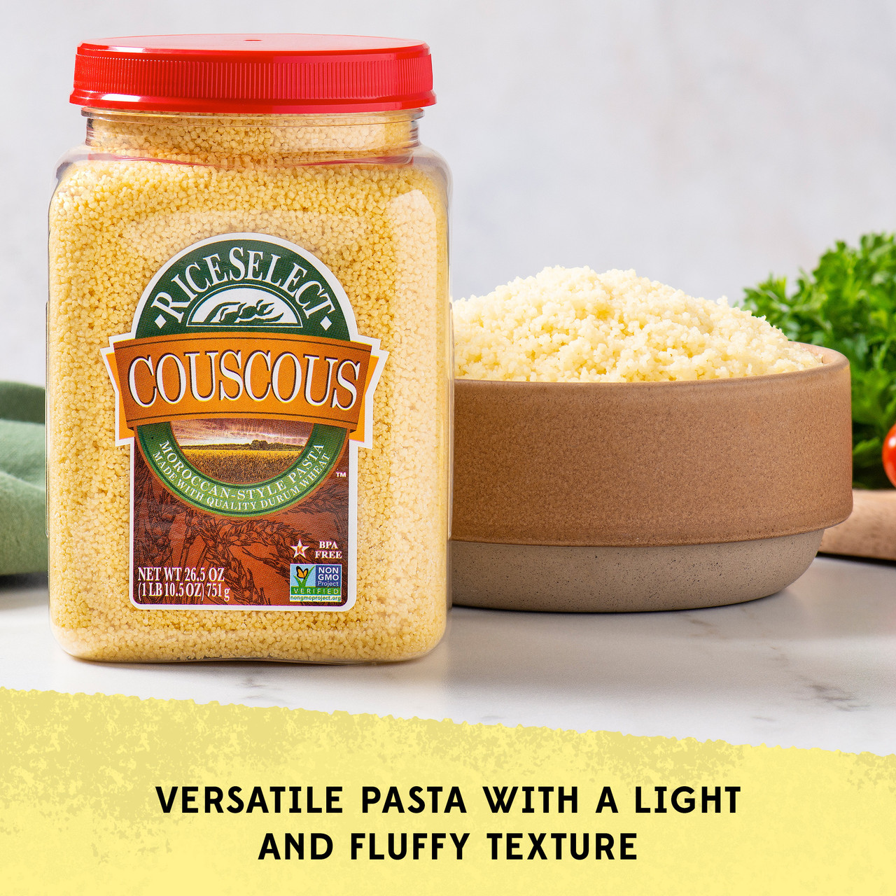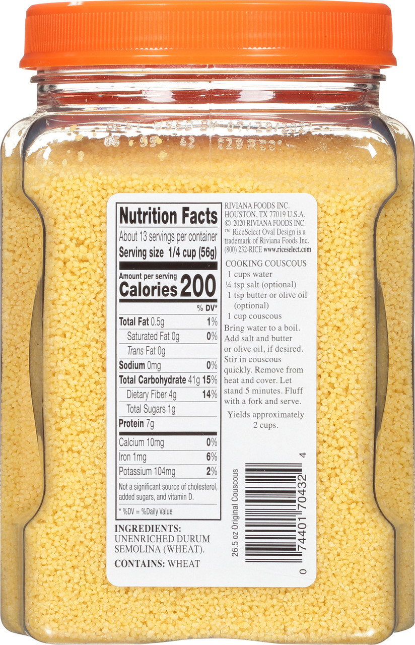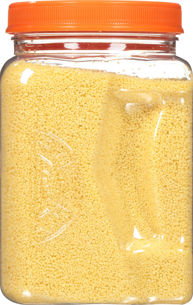 Our traditional Couscous is a tiny pasta that is extremely light and fluffy when cooked. Golden in color. Versatile. All natural. A quick and easy substitute for rice or potatoes. Star-K Kosher Certified.