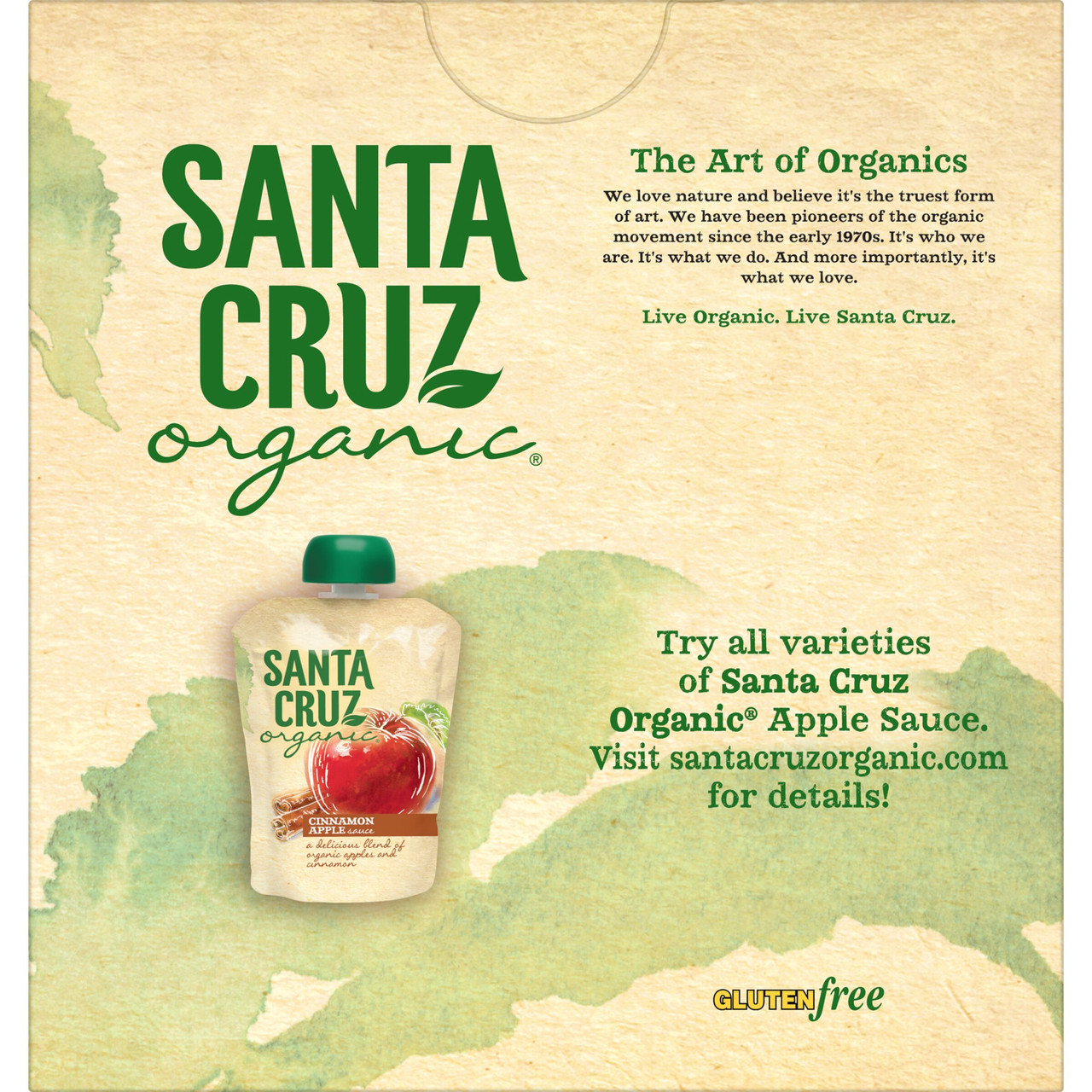 With Santa Cruz Organic Apple Sauce pouches, you an now take your favorite organic apple sauce with you on all of your everyday adventures! Not only will you love the taste, but youll also know youre helping the planet wit this Green-e certified product. Twist off the cap and enjoy!60 Calories0g Sat Fat0mg Sodium12g Sugars