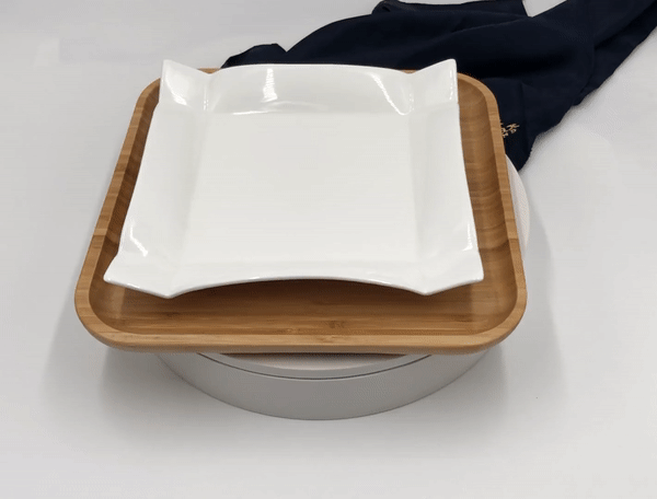 • An elegant mix of Organic and Modern look is what we were going for when creating this perfect combination of a 12” square Bamboo charger (underplate) coupled with a 10” square envelope corner platter in this unique fine porcelain serving dish.  While a large 12” plate can be used on its own for your daily serving of meats and vegetables or even desserts it also adds contrast when used together with a smaller 10” square plate in fine porcelain.