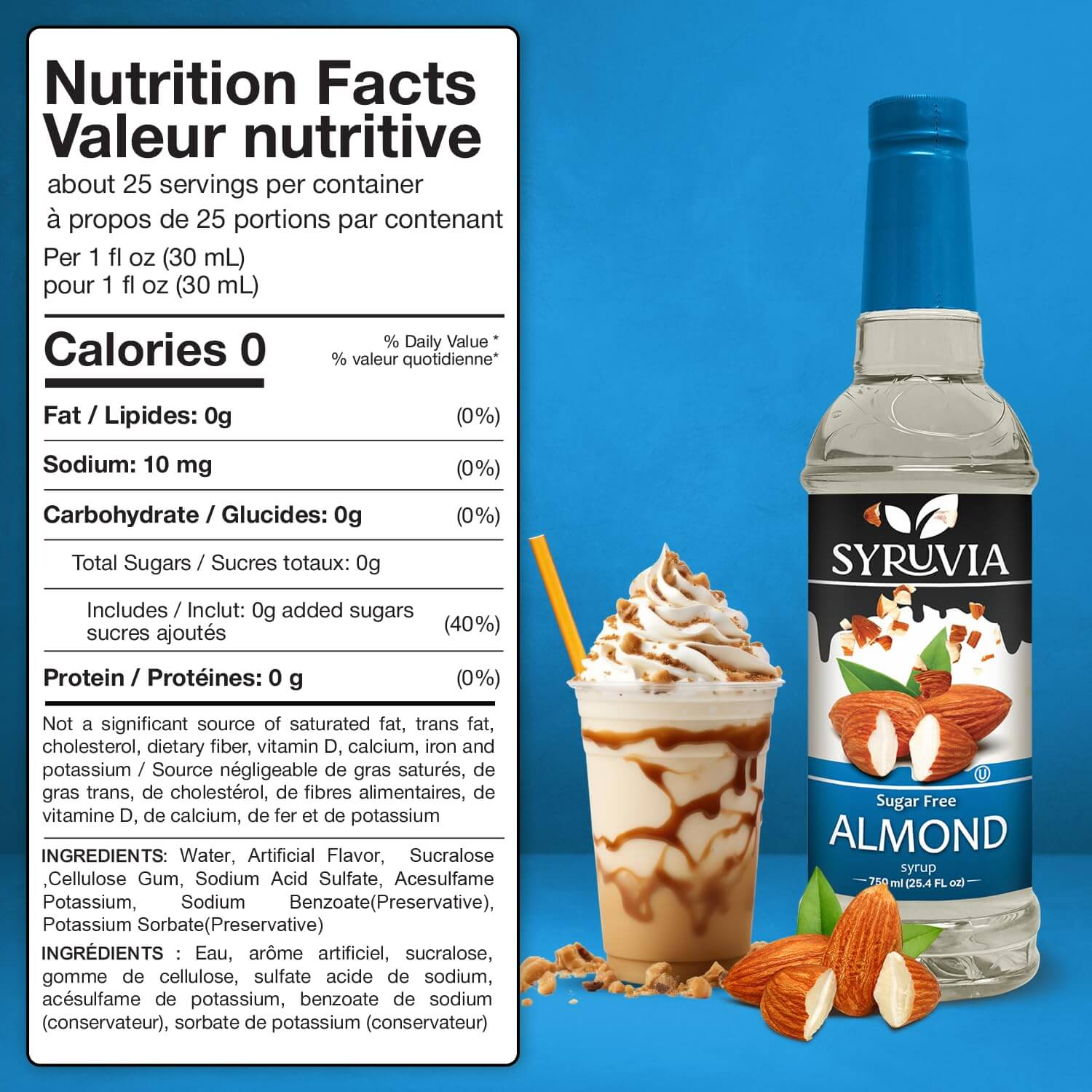 - SUGAR-FREE ALMOND SYRUP: Savor the rich, nutty flavor of roasted almonds without the sugar. Syruvia’s Sugar-Free Almond Syrup delivers a smooth, elegant taste that enhances your favorite beverages, desserts, and treats, all while keeping it guilt-free and delicious!