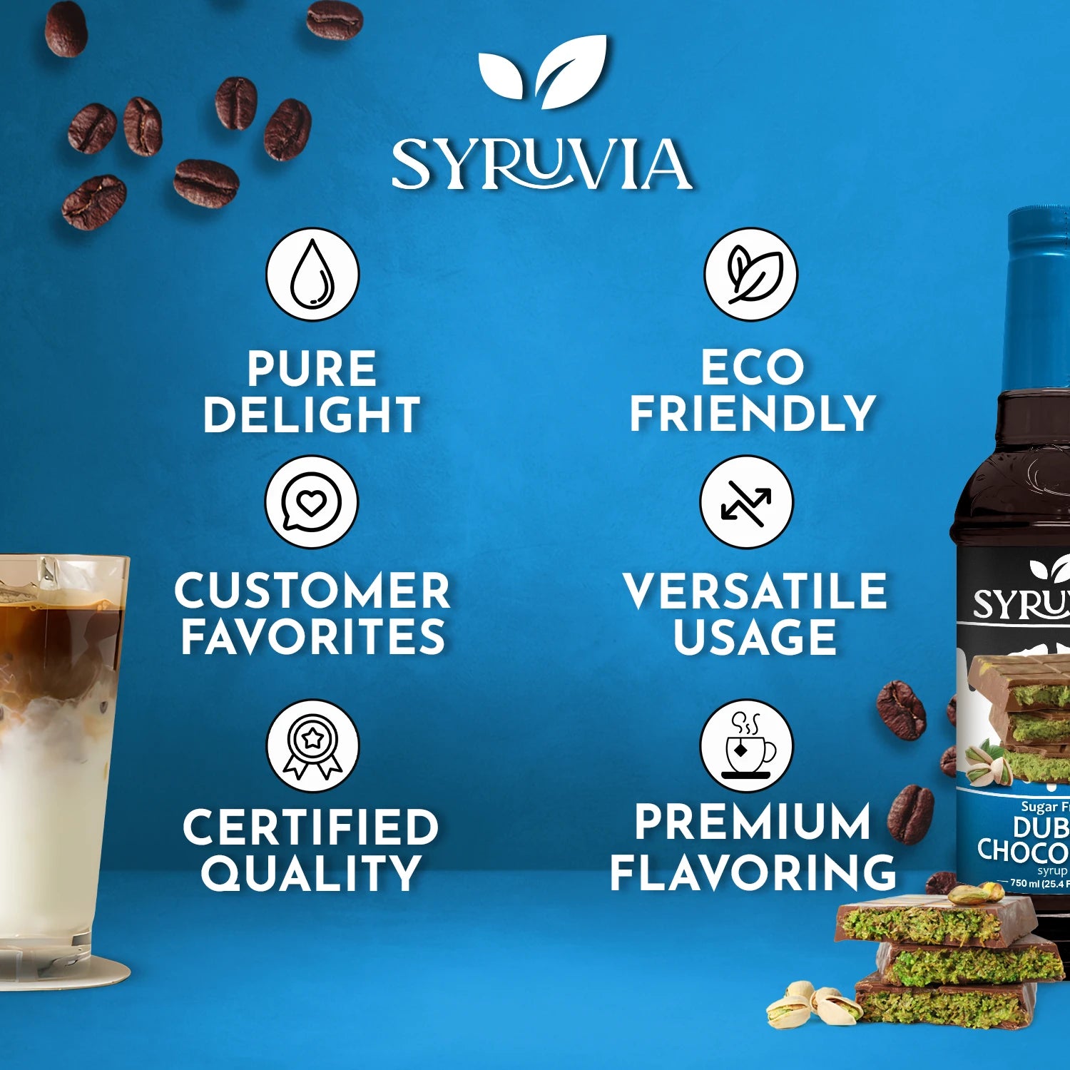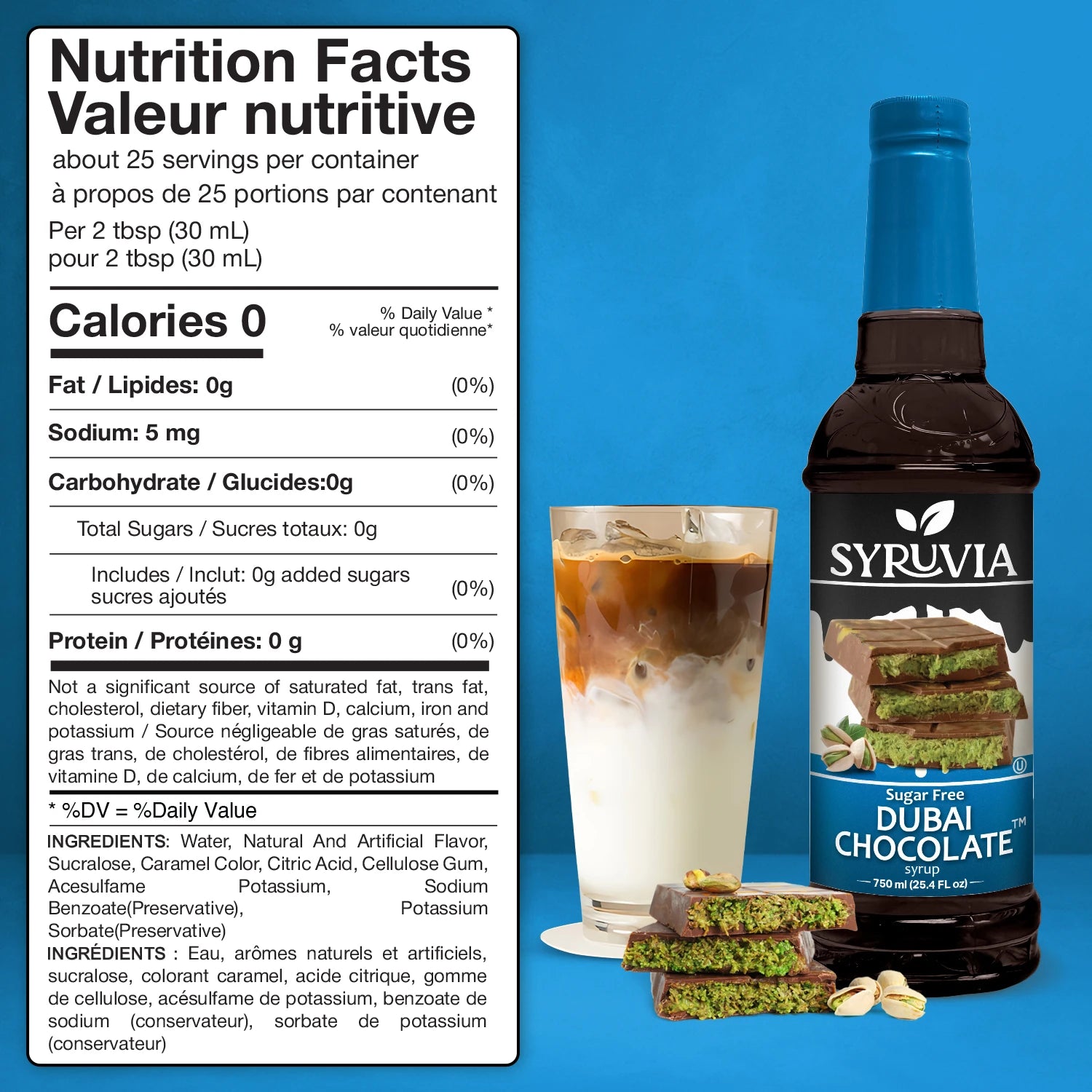 Syruvia’s Sugar Free Dubai Chocolate Syrup combines smooth milk chocolate with a subtle pistachio twist—without the sugar. Crafted for flavor lovers who want a guilt-free option, this syrup is perfect in lattes, iced coffee, milkshakes, and desserts. It’s a luxurious, keto-friendly syrup that brings bold, nutty sweetness to every cup.