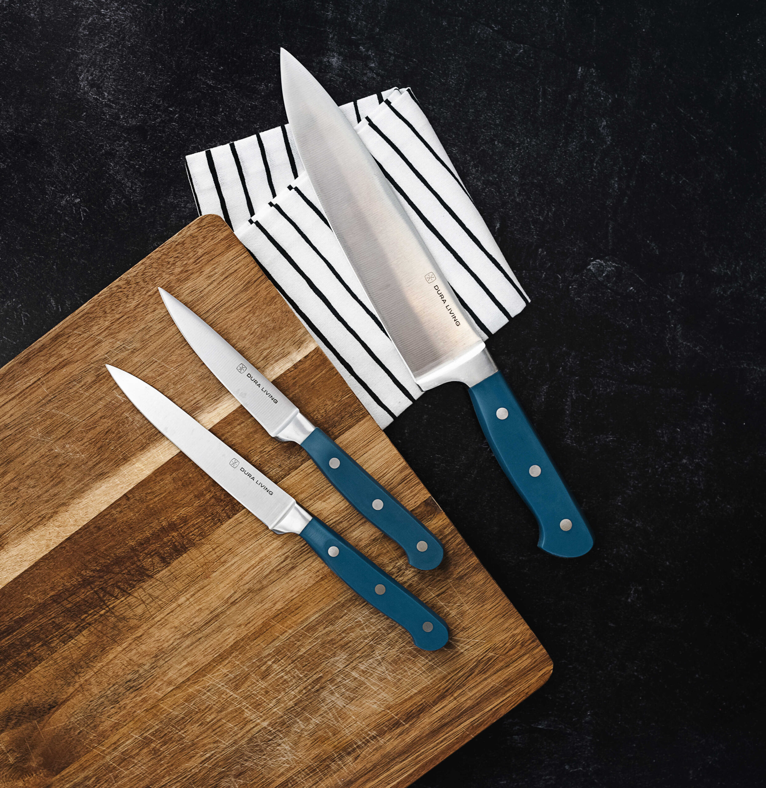 Elevate your kitchen experience with the Dura Living Forged 3-Piece Kitchen Knife Set. Crafted from high carbon steel, this set includes an 8-inch chef knife, a 5-inch utility knife, and a 3.5-inch paring knife, offering a versatile range of tools for all your culinary needs. Each knife features a precision-forged blade for exceptional sharpness and edge retention, while the ergonomic handles provide a comfortable and secure grip.