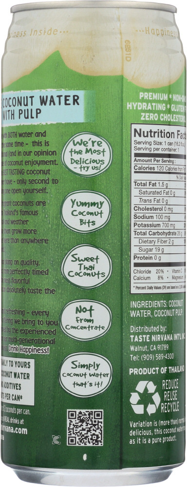 Save on Taste Nirvana Real Cocunut Water with Pulp . Our coconuts are harvested from Nakorn Pathom province. The coconuts from this region grow larger and sweeter than in other regions of Thailand. Coconut water with pulp is a great source of healthy fiber, electrolytes, potassium and iron. With no added preservatives our All Natural Real Coconut Water with Pulp is a great hydrating drink that can be a healthy and delicious part of your daily routine. (Description is informational only. Please refer to the actual manufacturer’s product label prior to use. Please address any health I4concerns to your health professional prior to use.)