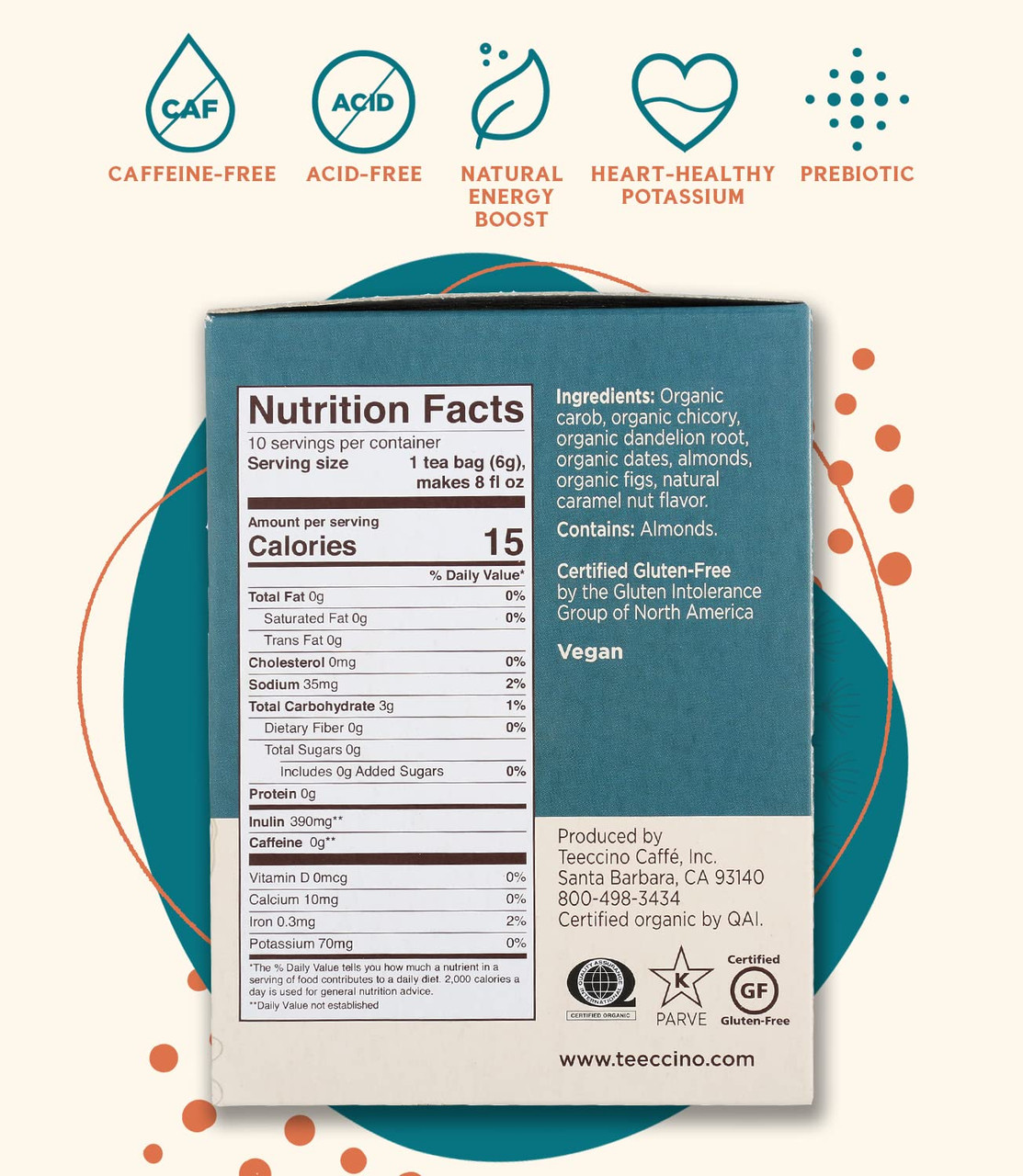 Barley-free & Gluten-free. A swirl of sweet and creamy caramel against roasted dandelion & nuts.