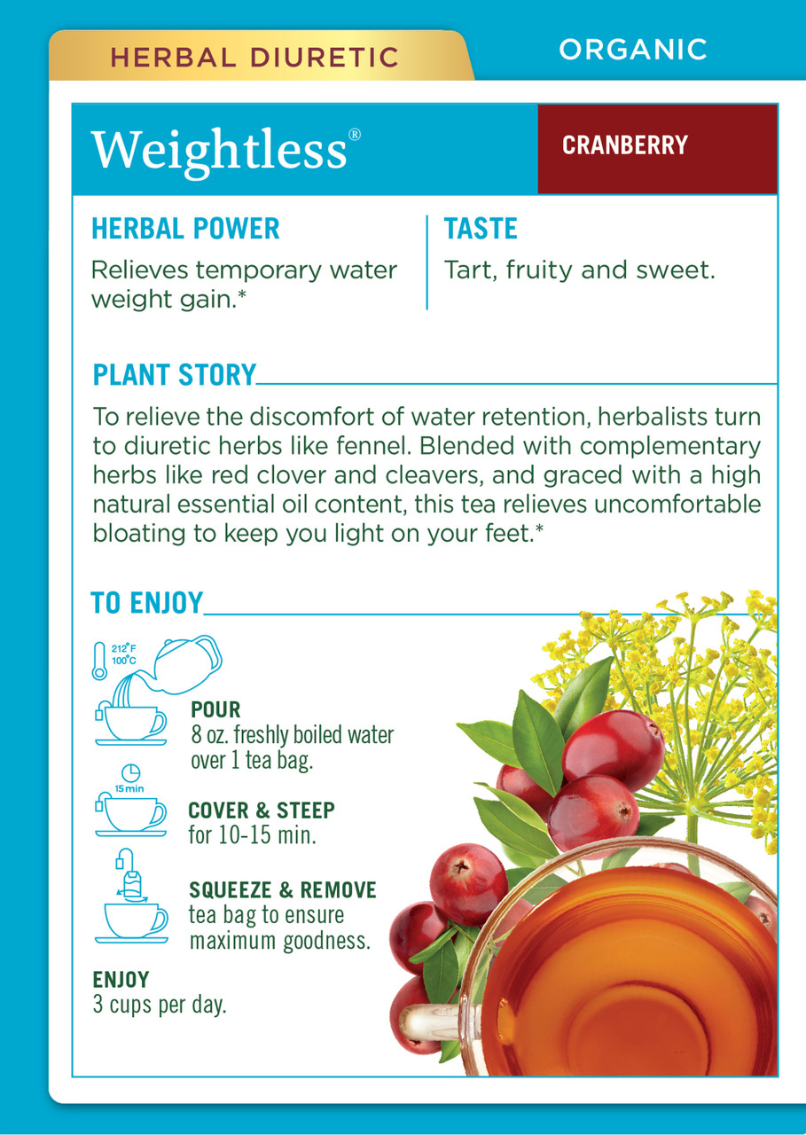 Retaining water can make you feel heavy, swollen and waterlogged. Probably the last thing on your mind is to drink tea or add more water to the situation! But actually, this tea contains diuretic herbs which have traditionally been combined to help your body eliminate excess water* and return you to a more comfortable condition. A blend of fennel, parsley, red clover, uva ursi, cleavers and chicory, as well as cranberry and hibiscus, we love the tart, fruity taste of this tea nearly as much as we love its ability to relieve water retention. Pleasantly tart and sour, with a mild anise-like taste.