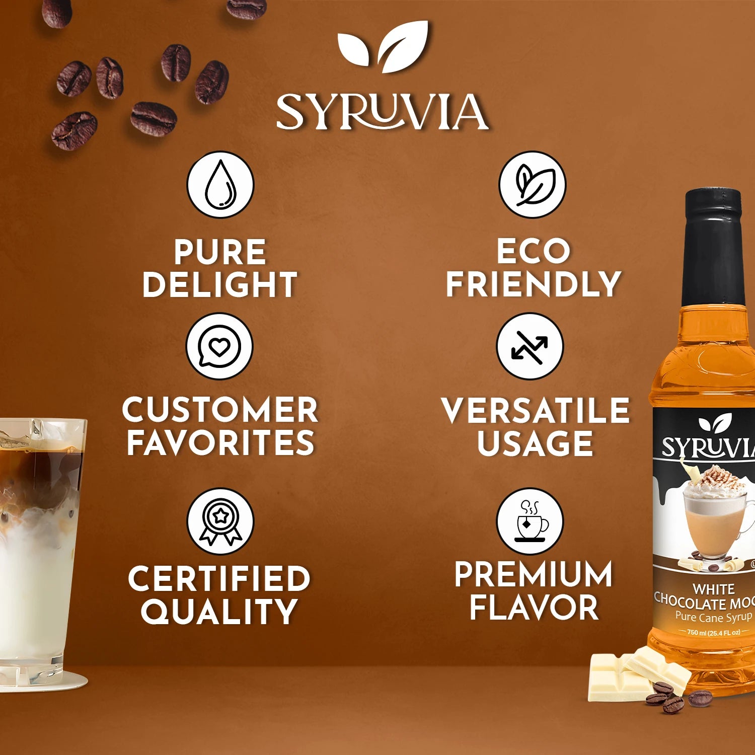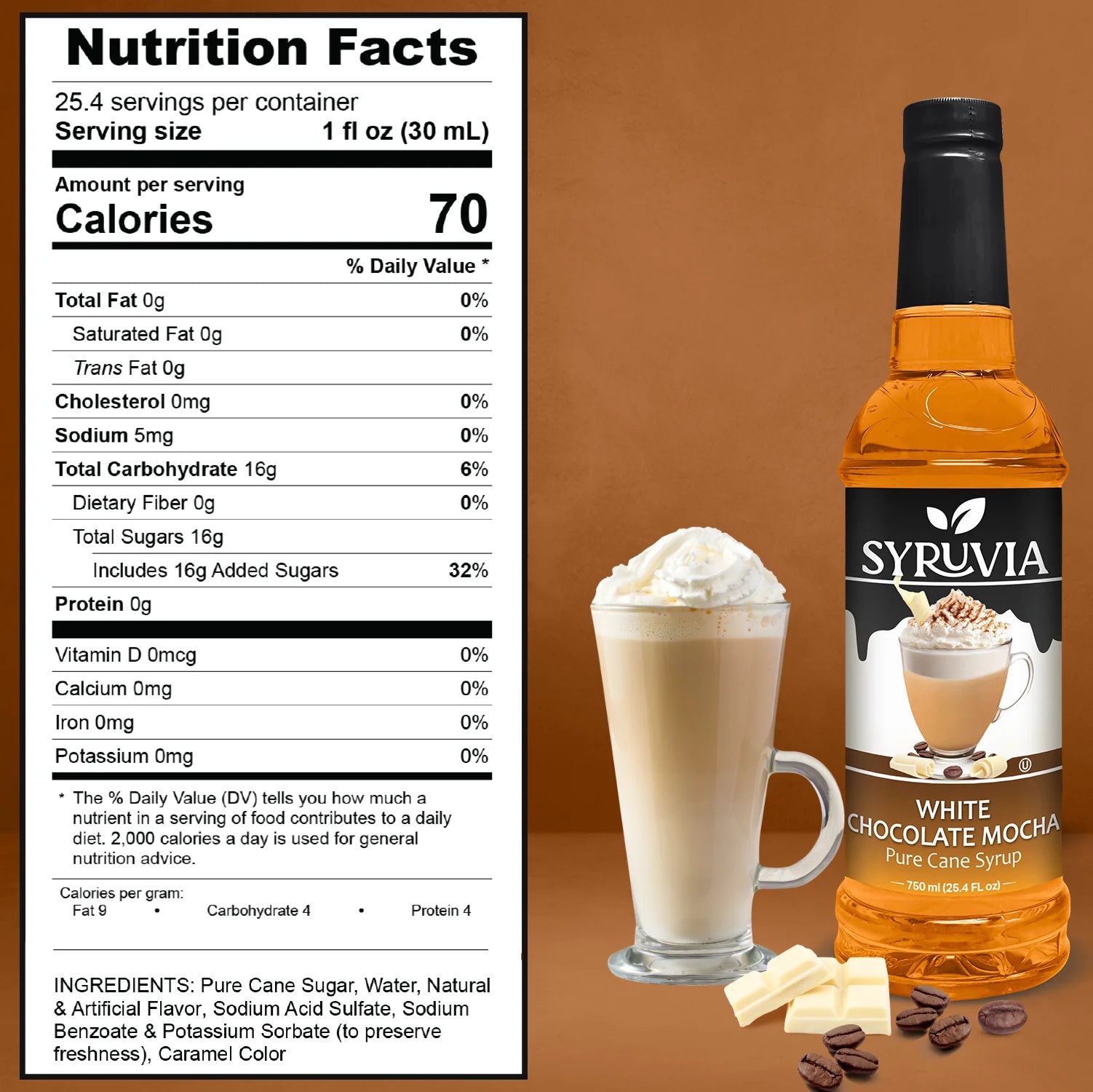 - Pure Cane Sugar: Syruvia White Chocolate Mocha is sweetened with pure cane sugar for a natural, authentic sweetness.